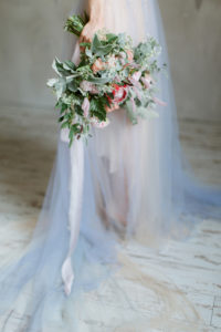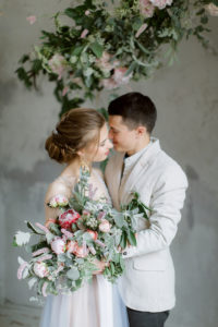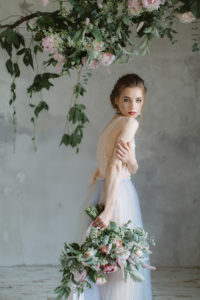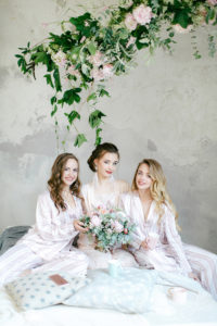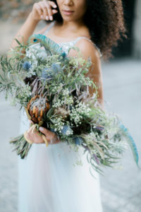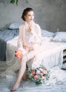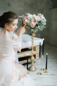 Panna młoda w sypialni: delikatna, czuła i pociągająca. Wznosząca się chmura zieleni nad jedwabnym łóżkiem, bukiet z genialną Proteą i delikatną wyciszoną zielenią.